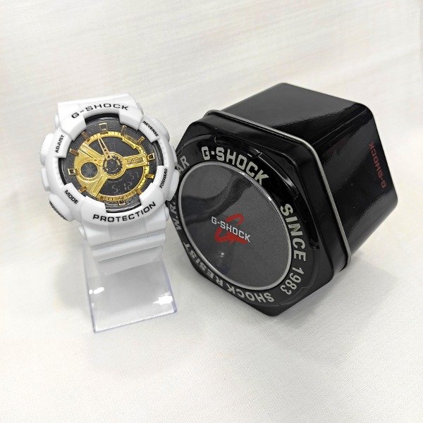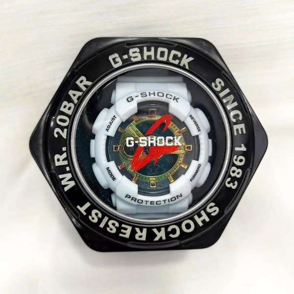 DISEÑO: 4 BOTONES AL DORSO PARA SU CONFIGURACION, TORNILLOS A LOS COSTADOS VISIBLES, MALLA REGULABLE Y DETALLES DEL FONDO EN COLOR NEGRO CON DORADO, RESISTENTE AL AGUA. FIRMA DEL BISEL: G-SHOCK/PROTECTION