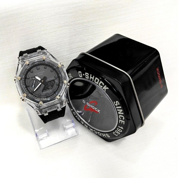 DISEÑO: 2 AGUJAS (hora y min.) CON FONDO Y PANTALLA DIGITAL OSCURO, 4 BOTONES AL DORSO PARA SU CONFIGURACION Y TORNILLOS VISIBLES A LOS COSTADOS. MALLA REGULABLE CON HEBILLA SIMPLE. BISEL translúcido CON 8 TORNILLOS DE FRENTE.