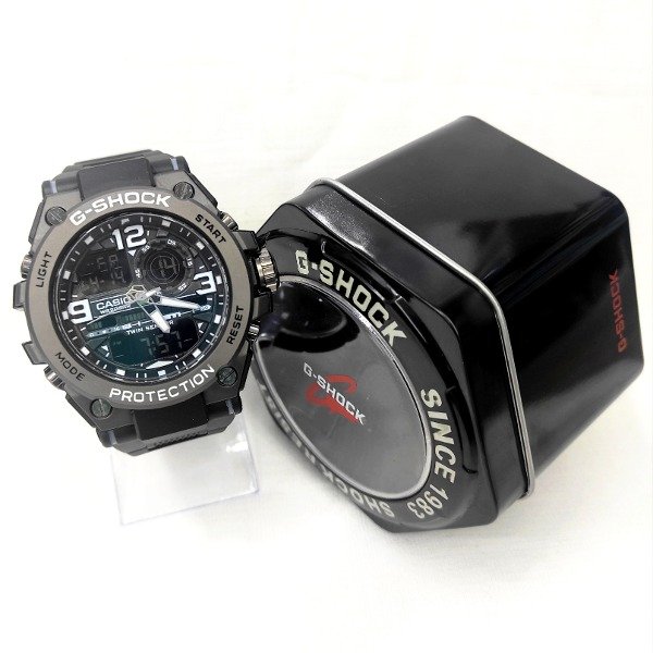 DISEÑO: 3 AGUJAS ( hora, min y seg). FONDO OSCURO, MALLA Y PANTALLA NEGRA. CON MARCADORES Y NUMEROS COLOR BLANCO.0 4 BOTONES AL DORSO + CORONA, 4 TORNILLOS VISIBLES DE FRENTE, 4 TORNILLOS AL DORSO VISIBLES Y HEBILLA SIMPLE CON FIRMA CASIO, TAPA DE CAJA METALICA Y FIRMA EN EL BISEL DE METAL NEGRO G-SHOCK/ PROTECTION