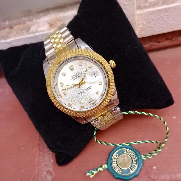 DISEÑO: ESFERA PULIDA CON FIRMA ROLEX Y BRILLOS INCRUSTADOS EN MARCADORES, LUPA EN FECHADOR Y FIRMA ROLEX AL DORSO DE LA HEBILLA DE MARIPOSA REGULABLE.